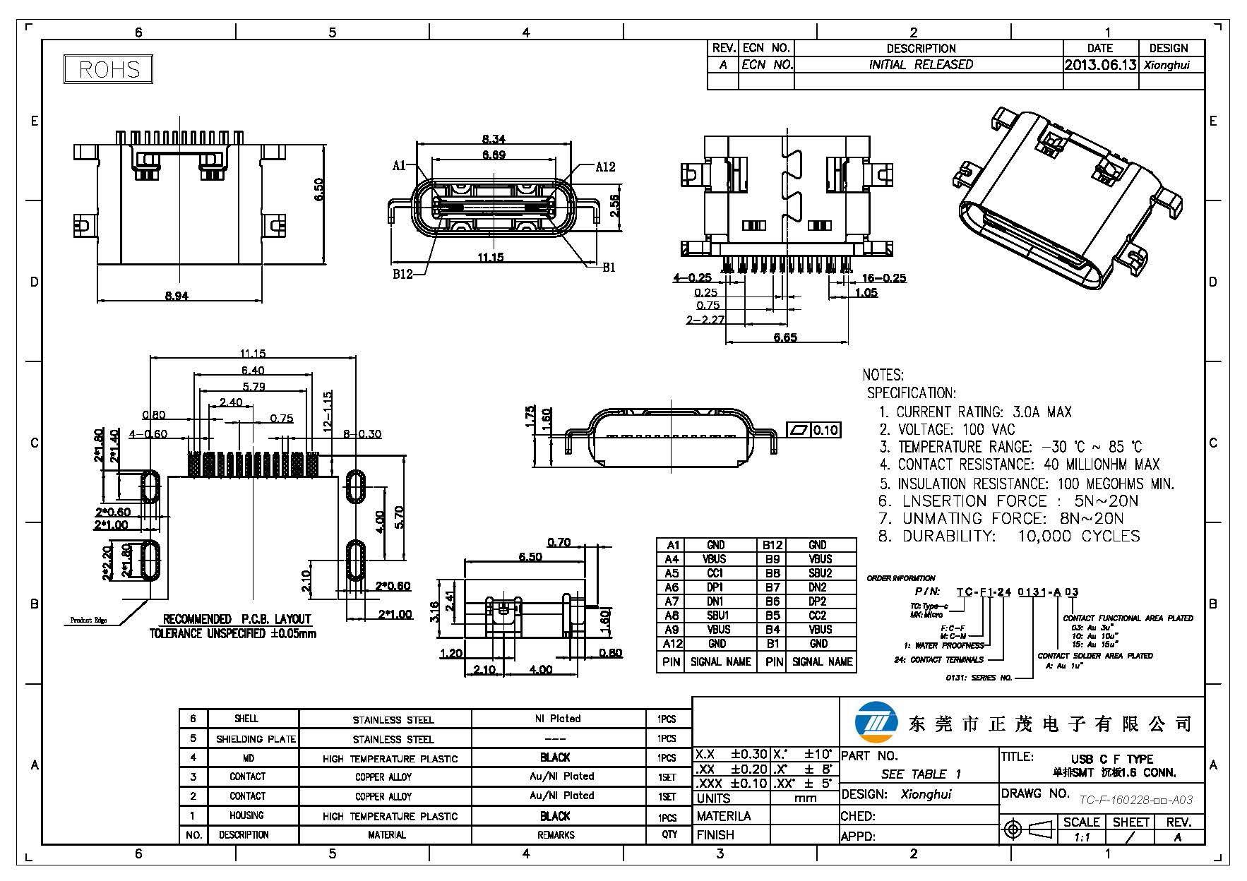 产品名称:Type-c母座 16P单排SMT 沉板1.6